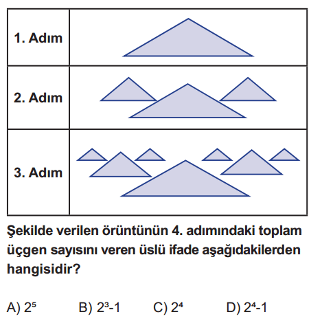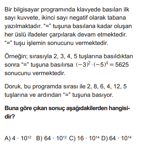 Aşağıda yer alan 8. sınıf matematik dersi LGS deneme sınavı ile kendinizi deneyebilirsiniz. 8. Sınıf Matematik dersi 1. ünite için eksiklerinizi belirlemeye yardımcı olacaktır. Sınav başında bir rumuz veya adınız ile sınava ücretsiz olarak kolayca katılın. Sınav bitiminde tüm soruların cevaplarının ye aldığı sayfa açılacaktır. Kendi cevaplarınız ile doğru cevapları karşılaştırabilirsiniz. Sayfayı yenilerseniz sınava girenler arasında kendi sıralamanızı da kolayca görebilirsiniz.